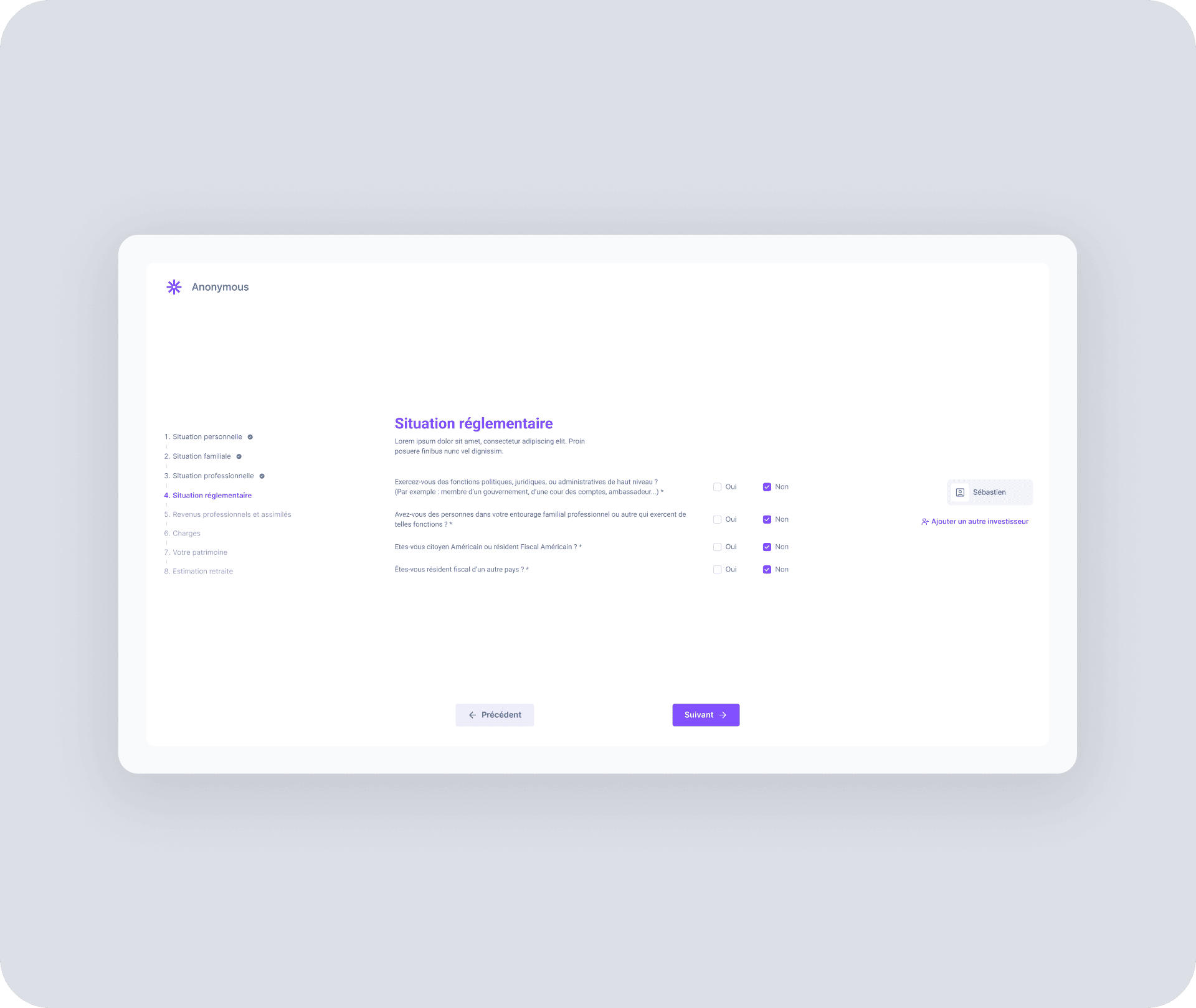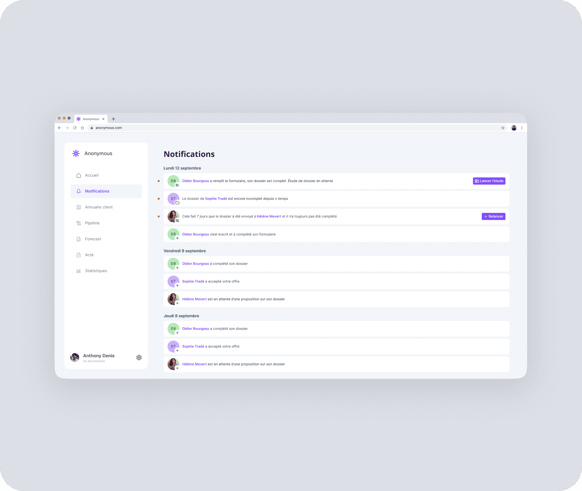 • Observation terrain et interviews des conseillers pour identifier les points de friction. • Cartographie du parcours actuel, et analyse des étapes redondantes ou sources d’erreurs. • Conception d’un parcours funnel simplifié, guidant les utilisateurs étape par étape. • Définition des notifications automatisées pour informer les conseillers et clients en temps réel. • Tests utilisateurs pour valider la fluidité du CRM et l’intuitivité des interfaces.