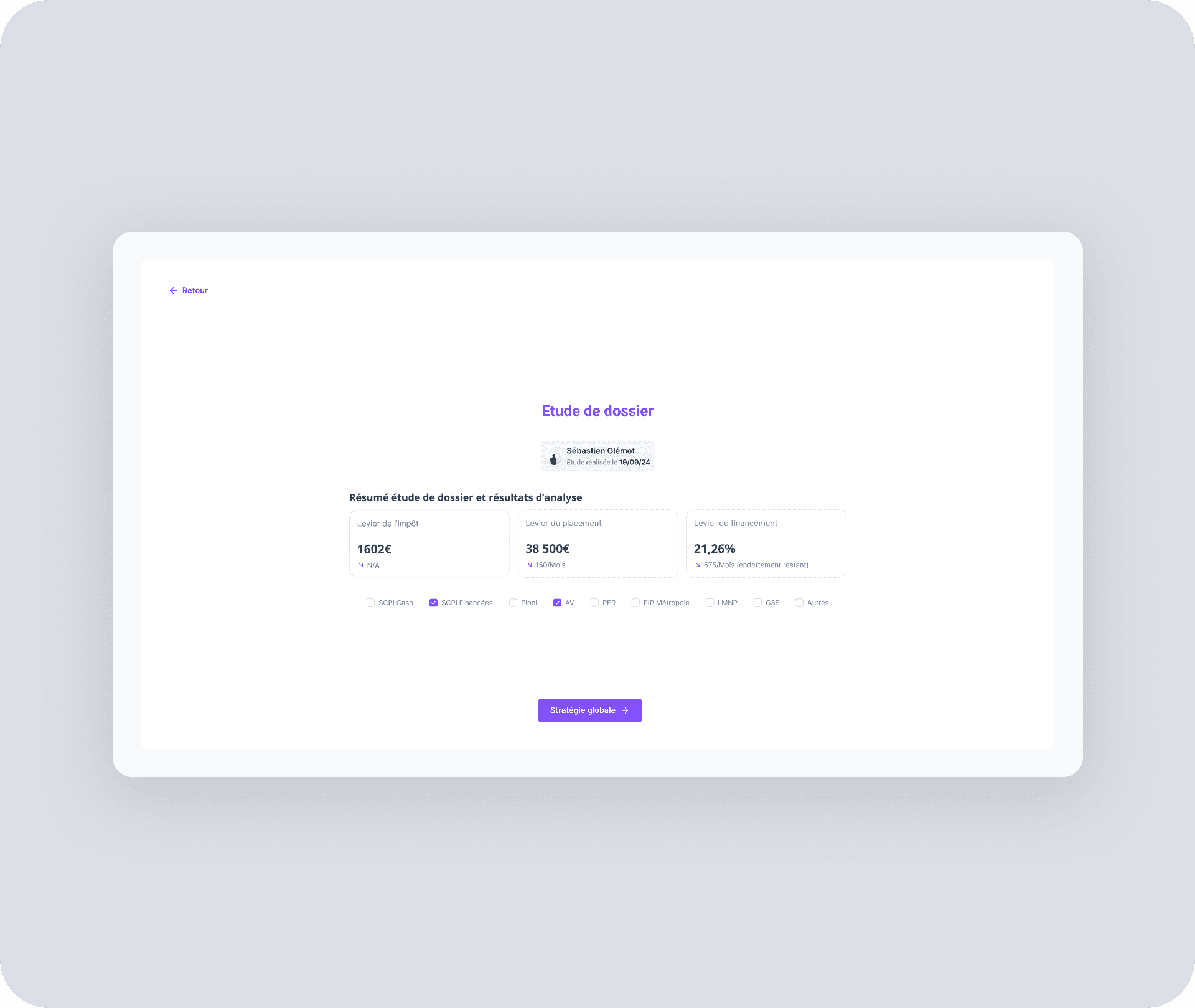 • Accélérer le traitement des dossiers et augmenter la vélocité des conseillers. • Centraliser les informations dans une base de données unique, fiable et accessible. • Simplifier le parcours utilisateur avec un funnel clair et intuitif, pour saisir les informations directement depuis chez eux. • Réduire les interactions superflues (déplacements, appels) grâce à un système de notifications automatisé. • Permettre aux clients de suivre facilement l’état d’avancement de leur dossier.